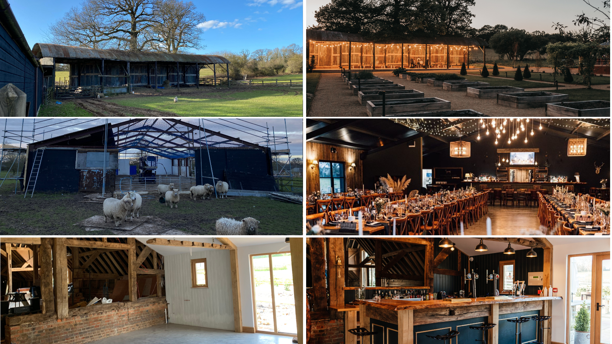 Before and after pictures of the Dutch Barn (top), The Cowshed (middle), and the bar in The Old Hen House (bottom).