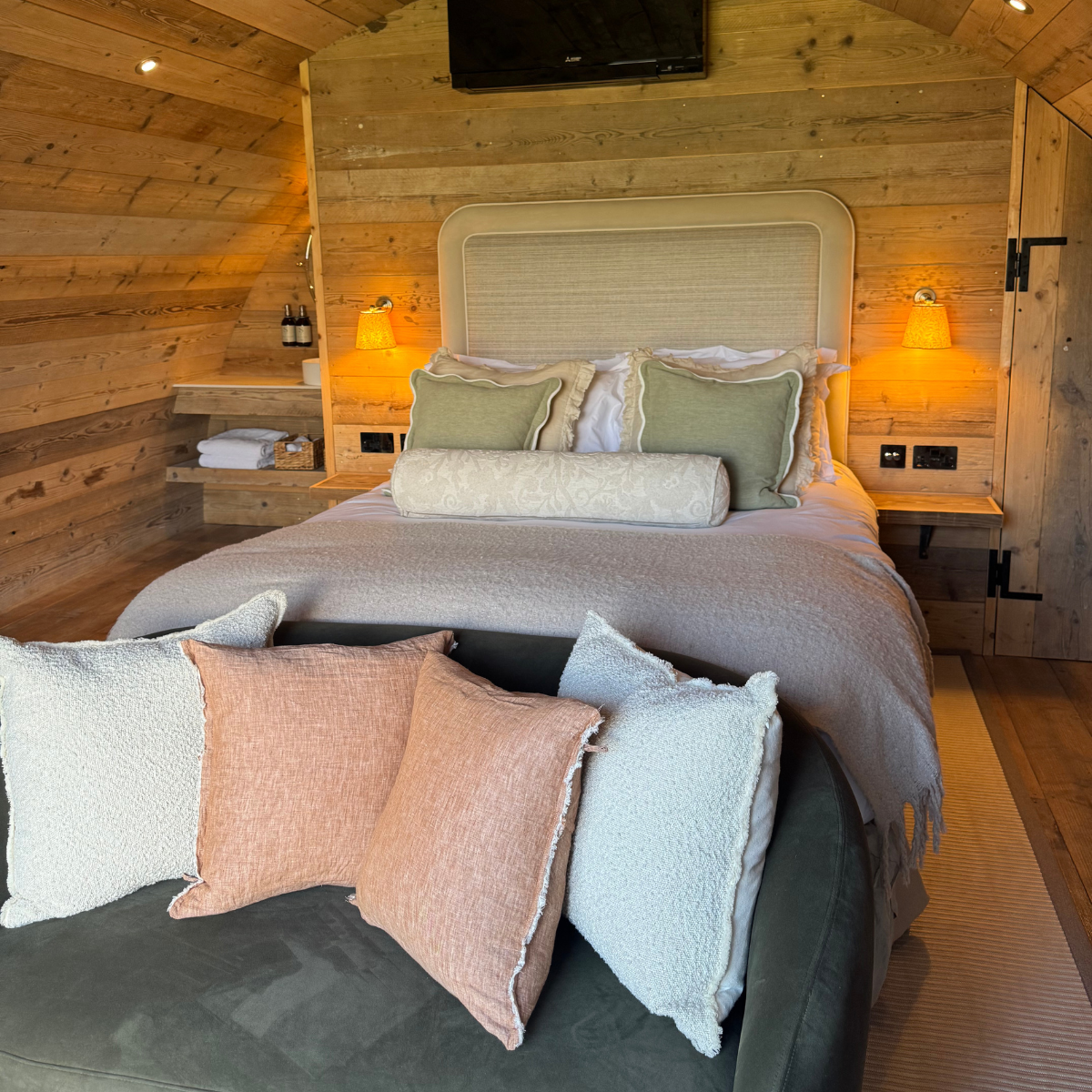Cosy up in our Luxury Silchester Pyggies — the perfect retreat for one or two guests. Enjoy a comfortable king-size bed, refresh in a luxurious en-suite with a spacious shower, a kitchenette, television, and seating area — all with charming views of the farm and gardens.