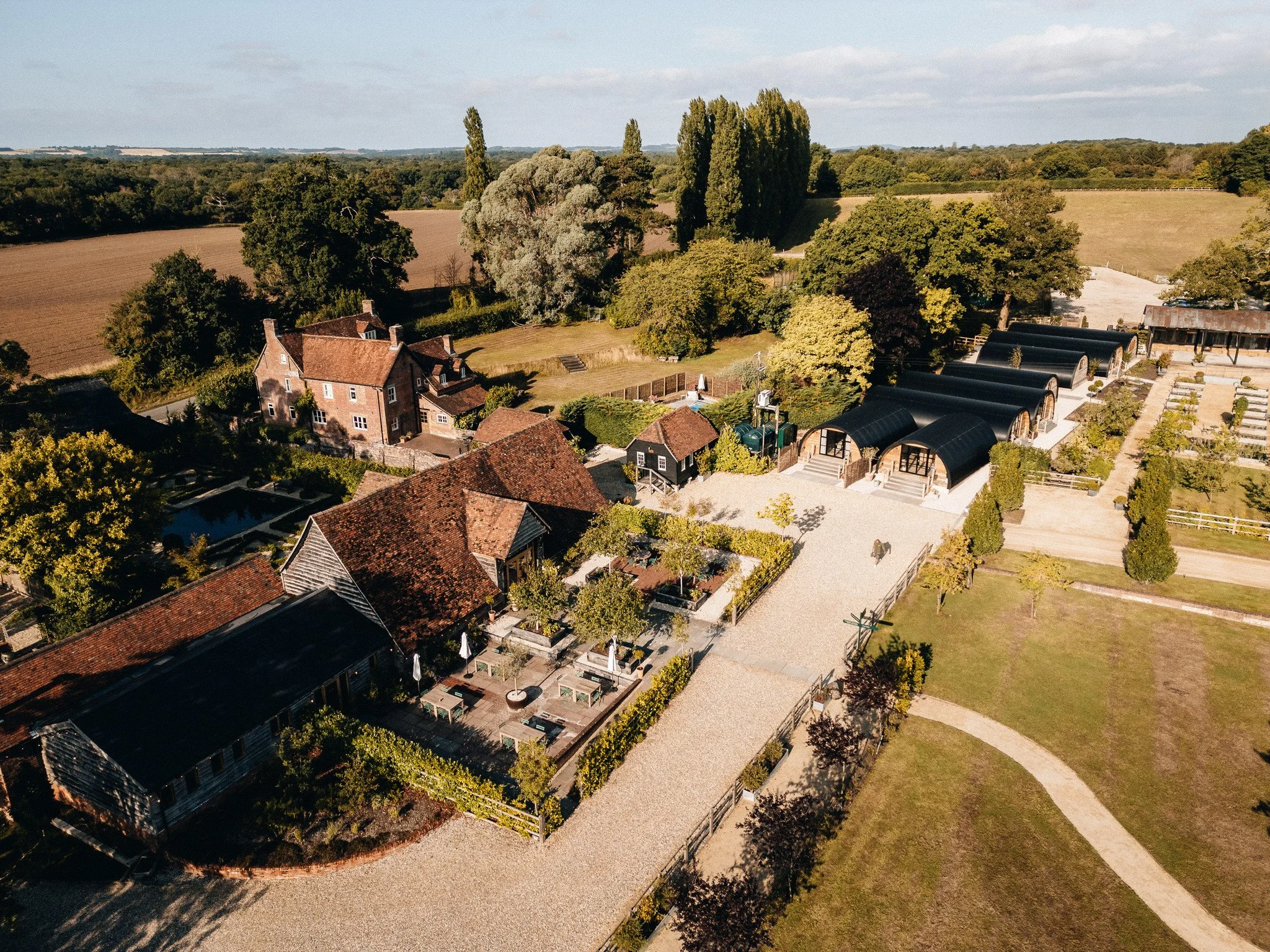 We can sleep up to 47 guests staying in the accommodation on site. With a mix of family sharing houses and 10 private suites across the farm. Elements of the accommodation are compulsory as part of your booking. Our traditional Farmhouse sleeps 15, in 7 bedrooms. The Barn House sleeps 12, in 6 bedrooms and in addition to the above accommodation, our collection of Luxury Pyggies accommodate an additional 18 guests, in 9 guest suites across 6 handmade pods which have been carefully designed and built in Hampshire. Each boasts a king size bed, kitchenette and stunning private rural views for all event and wedding guests to wake up to. Our final and most unique space, the original Granary, offers a tranquil space for 2.